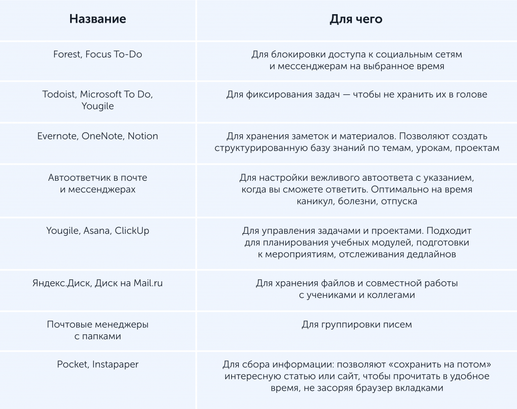 Поддерживать кибергигиену можно с помощью специальных инструментов. В таблице — несколько популярных приложений, программ и сервисов, которые могут вам пригодиться.