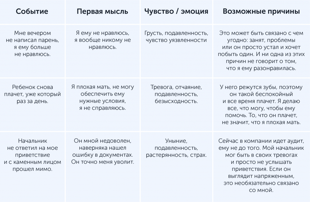 Человек, который находится в депрессии, фокусируется на негативе и думает в общих категориях: например, «Я не умею справляться с трудностями. И никогда не умел». При этом он не видит положительных моментов. Поэтому важно тренировать в себе этот навык, запоминать и записывать в дневник положительные детали. Пусть даже небольшие. Ниже — пример.