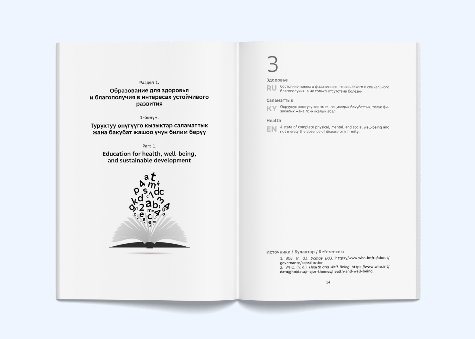 - Раздел 1. Образование для здоровья и благополучия в интересах устойчивого развития. Посвящен терминам, связанным с формированием знаний, навыков и установок, которые позволяют детям и педагогам вести здоровый образ жизни. В основе его содержания — принципы устойчивого развития и подходы, поддерживающие физическое и ментальное здоровье, а также благополучие человека.