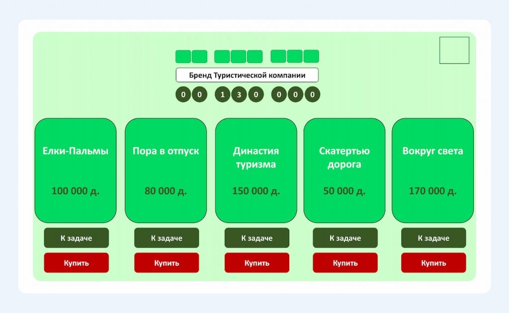 Изначально у каждой компании есть стартовый капитал – 300 000 дублей. После жеребьевки команды выбирают название: покупают или получают бесплатно, ответив правильно на вопрос. Чем креативнее название, тем дороже цена и сложнее задача. Если команда выбрала решение задачи, но не справилась с ней, со счета списываются денежные средства в размере стоимости выбранного названия бренда.