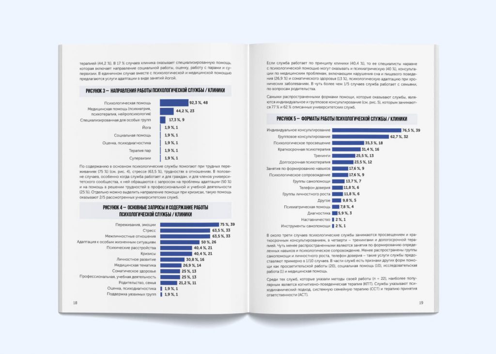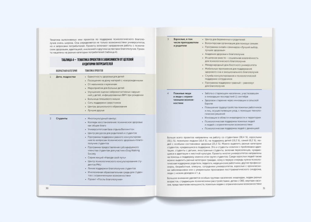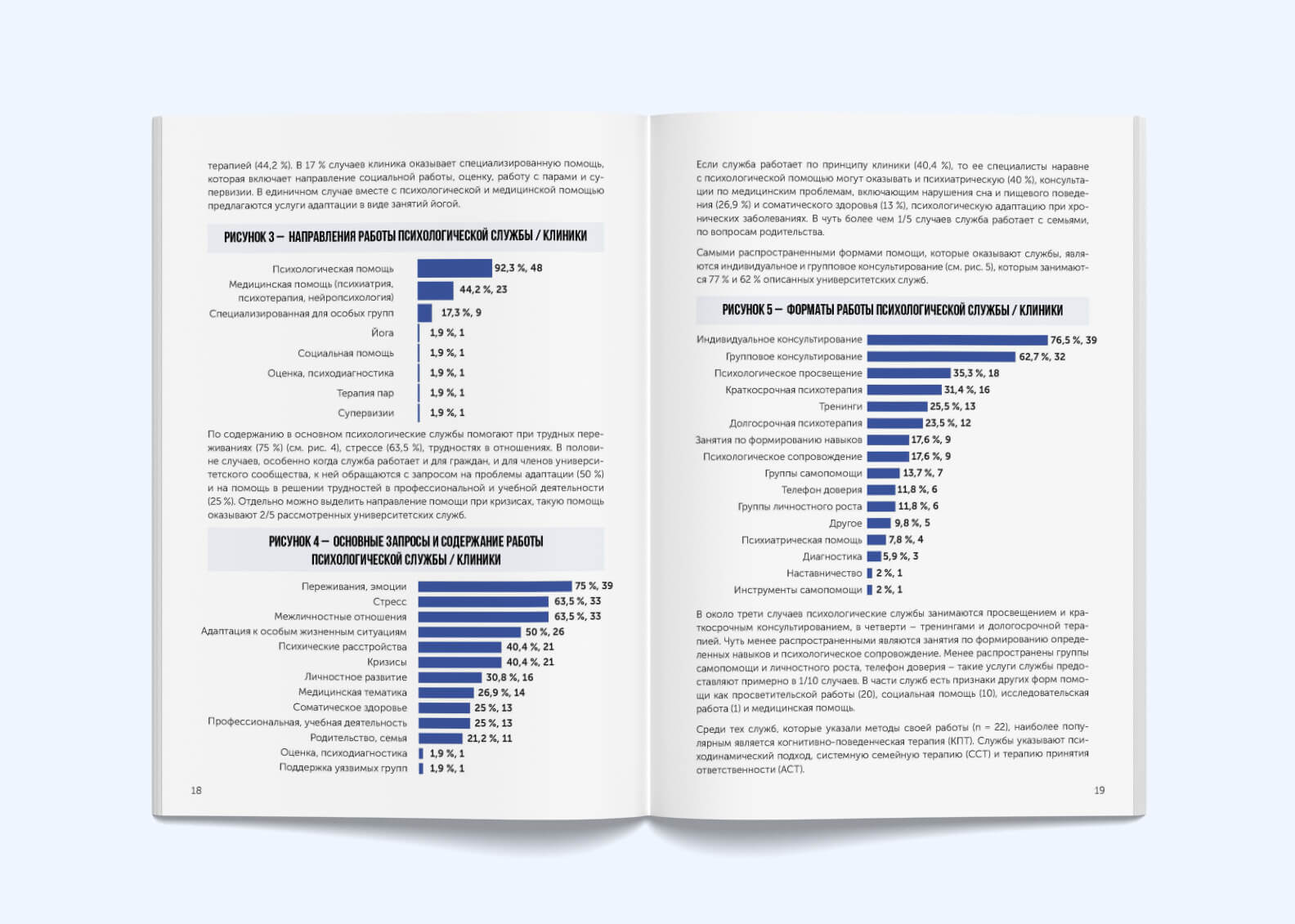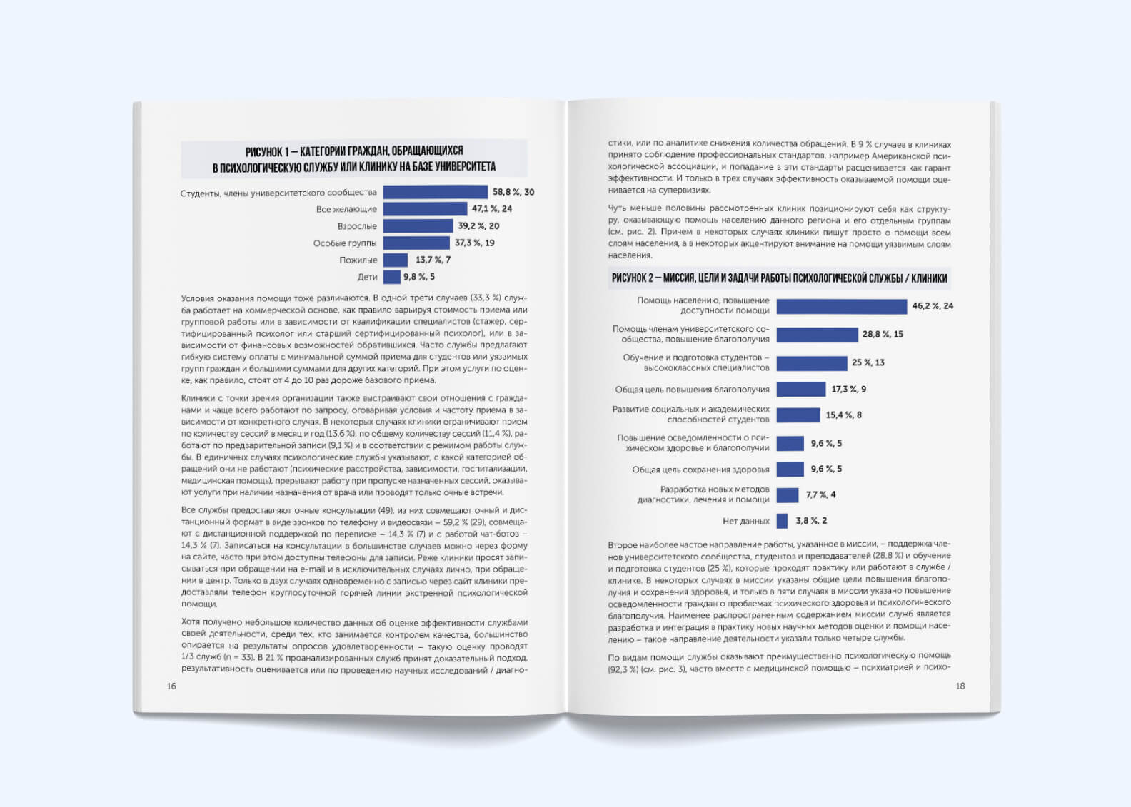 В исследование вошла 271 практика из 100 университетов 28 стран. Наибольшее число примеров из университетов Европы (37,6 %), а также Азии (25,9 %), Северной Америки (17,6 %), Австралии и Океании (16,5 %), Южной Америки и Африки (менее 3 %). Среди них — университетские клиники, социальные проекты для детей, родителей и пожилых людей. Авторы исследования отмечают, что забота о психическом здоровье сегодня становится частью образовательной миссии, а не только задачей специалистов-психологов.