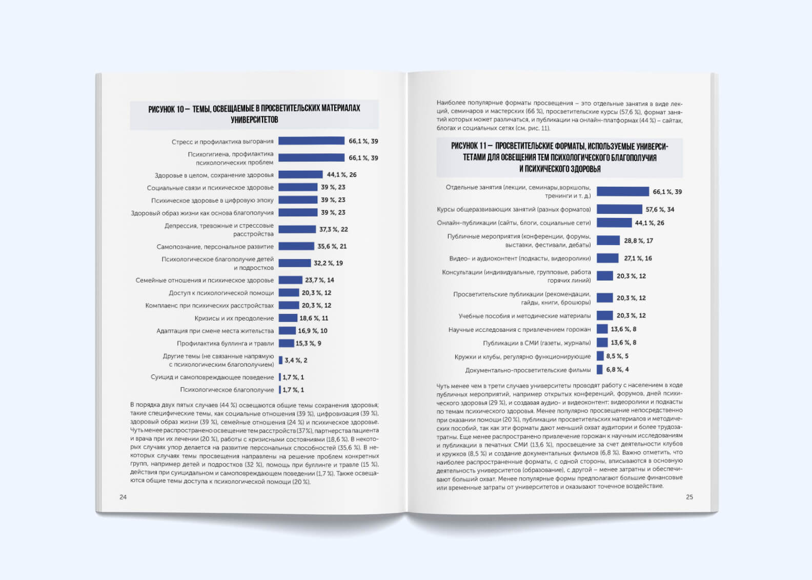Развивают просветительскую деятельность. Просветительская работа выходит далеко за рамки лекций. Помимо офлайн- и онлайн-образовательных мероприятий университеты ведут социальные сети и авторские каналы на видеоплатформах, выпускают подкасты, создают мобильные приложения и даже используют наружную рекламу в городе. Так университеты становятся проводниками знаний о том, как заботиться о себе и близких. Это позволяет говорить о психическом здоровье открыто и снижать стигму.